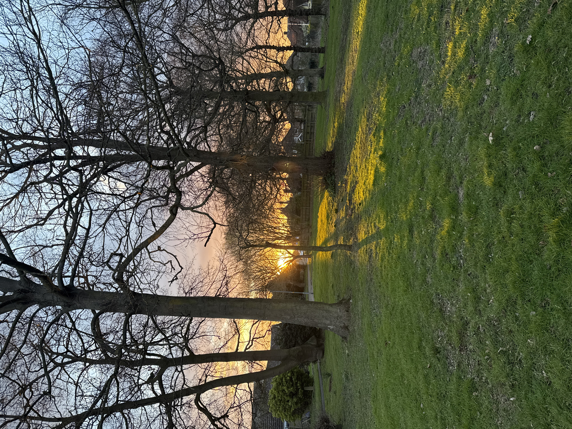 The image depicts a park scene in Gorleston-on-Sea, United Kingdom, likely at sunset. The focus is on a row of bare trees silhouetted against the setting sun. The sun's rays filter through the branches, creating a warm glow. The foreground is dominated by a green lawn with shadows cast by the trees. In the distance, houses and other structures are faintly visible through the trees. No people are visible in the frame. The scene is serene and evokes a sense of tranquility.