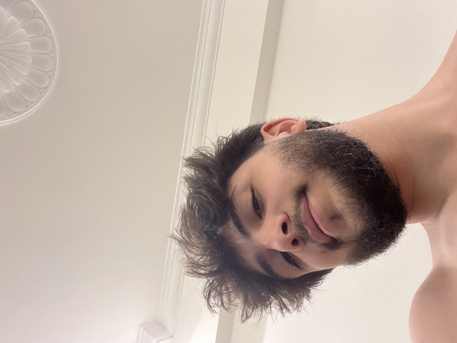 A young adult male is depicted in a low-angle, close-up indoor photograph. The subject has dark, tousled hair, dark eyes, and a full dark beard and mustache. He faces the camera directly, exhibiting a slight upturn at the corners of his mouth. His bare right shoulder and upper chest are visible in the foreground. The background features a plain, light-toned wall, bordered at the top by white crown molding. A segment of a white, radially patterned ceiling medallion is visible in the upper right corner of the frame. The scene is evenly illuminated. This location is identified as Rukn ad-Din Municipality, Syria.