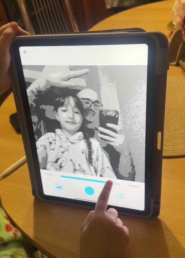 child using a tablet. The tablet is encased in a protective cover and displays a black and white pixelated image of a selfie with a man. The child is touching a slider on the screen, labeled with "EASY" and "HARD," seemingly adjusting the image's difficulty. The tablet rests on a wooden table. In the background, there are wooden chairs, a kitchen cabinet, and other objects, slightly out of focus. The child is wearing a green patterned sweater.