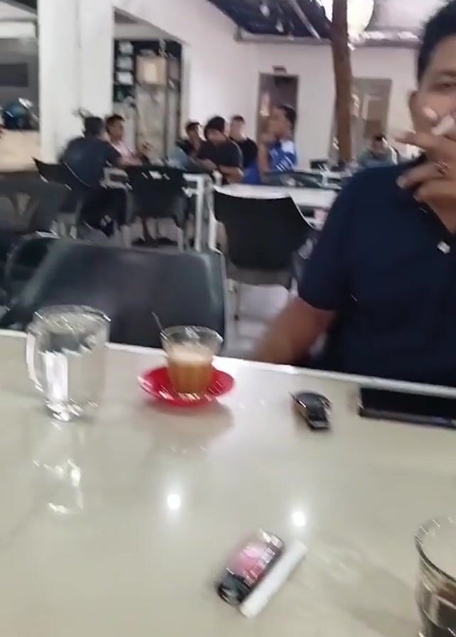 interior of a cafe. Several people are seated at different tables, some looking at their phones and others talking. One man is smoking and is sitting at a table with a coffee cup, a lighter, and a pack of cigarettes. The cafe appears to be well-lit and has a casual atmosphere. A TV is visible on one of the walls.