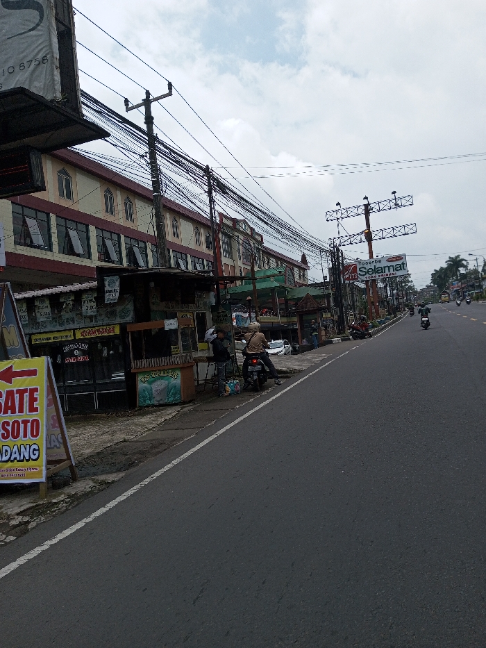This image captures a street scene in the city of Chendenbji, Bhutan, under an overcast sky. The primary focus is a paved asphalt road extending into the distance, bordered on the left by a dirt and concrete shoulder with commercial structures. On the immediate left, a prominent yellow and red A-frame sign displays "SATE SOTO PADANG" with a left-pointing arrow. Behind it, a series of small, informal food stalls or kiosks with corrugated metal roofs are visible. These stalls feature various hand-written signs, some displaying prices such as "Rp. 3.000" and "Rp. 5.000." Further back, a multi-story building with a light-colored facade and reddish-brown trim spans the length of the street, featuring numerous windows, some with arched tops and others rectangular and partially open. Lining the street in front of these buildings are several utility poles supporting a dense, complex network of overhead electrical and communication wires. Near the foreground kiosks, two individuals are present. One person, wearing a dark jacket and a white helmet, stands next to a dark motorcycle parked on the shoulder. Another person, dressed in a lighter jacket, is seated on a second dark motorcycle positioned slightly behind the first, facing away from the viewer. The road itself is dark asphalt, marked by a solid white line defining the shoulder on the left. In the midground, further along the street on the left, a large billboard structure displays the word "Selamat" in red text. Multiple motorcycles are observed traveling away from the camera in the distant lanes of the road. A white car is partially visible, parked on the left shoulder further down the street. Trees and additional buildings are visible in the background, receding into the hazy distance.