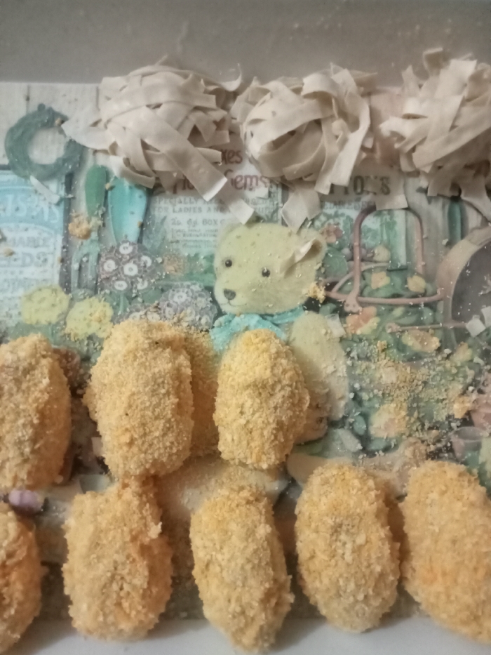 golden-brown, breaded food items arranged in rows, likely chicken nuggets or similar, on a surface decorated with a teddy bear and text. Above the nuggets, there are piles of tan-colored ribbon or fabric strips. Breadcrumb-like debris scatters across the surface, creating a textured visual. The background imagery is colorful and slightly distorted.