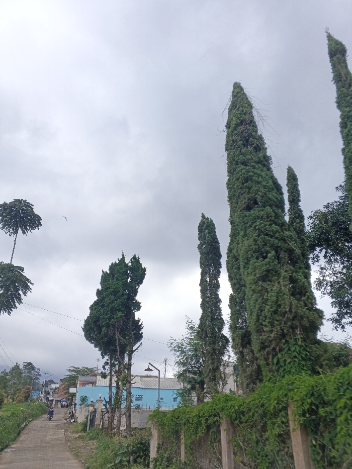 The image depicts an outdoor scene in Kalipayan, Philippines, under a uniformly overcast, gray sky. A concrete pathway, approximately 2-3 meters wide, extends from the foreground, gently curving and descending into the mid-ground. The pathway is flanked by grassy verges with sparse vegetation. On the right side of the frame, a concrete retaining wall, approximately 1.5 meters in height, is densely covered with green vines. Immediately behind and towering over this wall are several tall, slender evergreen trees with dark green foliage, exhibiting a conical or columnar shape. The most prominent of these trees, centered in the mid-right, has a pointed apex with some visible lighter, possibly dead, branches extending from its upper structure. Further to the left, a smaller, bushier evergreen tree is present. In the far upper-left, two trees with distinctive flat, rounded canopies, resembling fan palms, are partially visible. A single dark bird is captured in flight against the sky in the upper-left quadrant. Along the left side of the pathway, a series of structures are visible. The most discernible is a light blue, single-story building featuring multiple rectangular windows, set back from the path. Further along, other buildings with varying rooflines are observed. Utility wires are strung across the scene, and a modern street lamp is positioned above the blue building. On the concrete pathway in the mid-ground, a single individual operating a motorcycle is observed traveling away from the viewer. Additional indistinct human figures are visible further down the path near the cluster of buildings. Distant hills or mountainous terrain are discernible along the horizon in the background beneath the cloudy conditions.