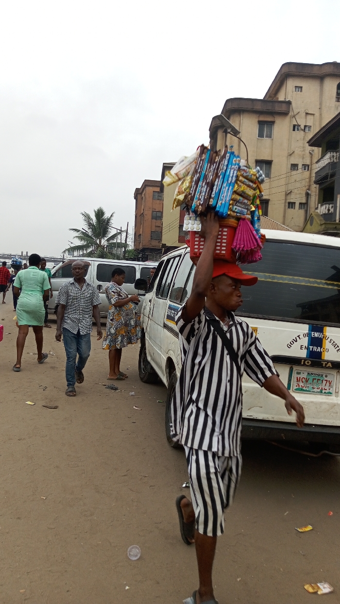 The image displays a bustling street scene in Onitsha, Nigeria, under an overcast sky. In the immediate foreground, a dark-skinned male street vendor walks from right to left, balancing a red plastic basket filled with packaged snacks, sweets, and what appear to be blister packs of medication on his head. He is dressed in a black and white vertically striped short-sleeved shirt, matching shorts, a red baseball cap, and black sandals. A black strap extends from his left shoulder. Behind the vendor, a white passenger van is parked, facing towards the left. The rear of the van bears the inscription "GOVT. OF ENUGU STATE ENTRACO" and displays a Nigerian license plate, "MCK 171Y". To the left of the van, another dark-skinned male walks left, wearing a light-colored plaid shirt, blue jeans, and sandals. Further to his left, a dark-skinned female in a light green short dress walks away from the viewer. Near the rear of the white van, a pregnant dark-skinned female in a patterned dress stands, focused on a device held in her hands. The ground consists of unpaved, dusty earth, littered with plastic cups and wrappers. In the background, several multi-story buildings, consistent with urban architecture, line the street. A single palm tree is visible amidst the structures. Other individuals and a second white vehicle are present further down the street, indicating ongoing pedestrian and vehicular activity.