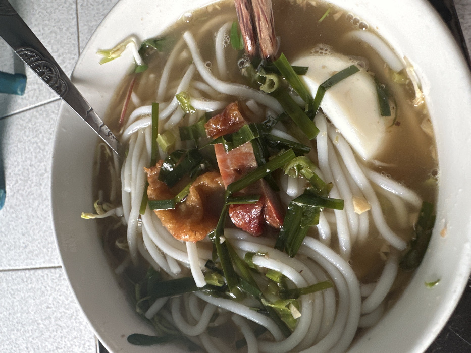 A top-down shot reveals a bowl filled with noodles in broth. The noodles are long, white, and round. The broth is a light brown color, with green onions and bean sprouts scattered throughout. Fried tofu, ham, and fried bread are also present. A metal spoon is visible on the left side of the bowl, and chopsticks rest near the top center. The bowl has a wide, shallow shape.