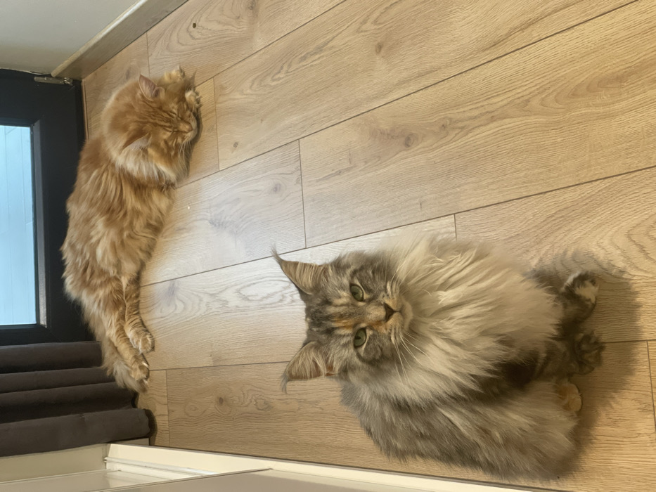 The scene depicts an indoor residence in the city of Unknown, Unknown, featuring two domestic long-haired cats on a light-colored wooden floor