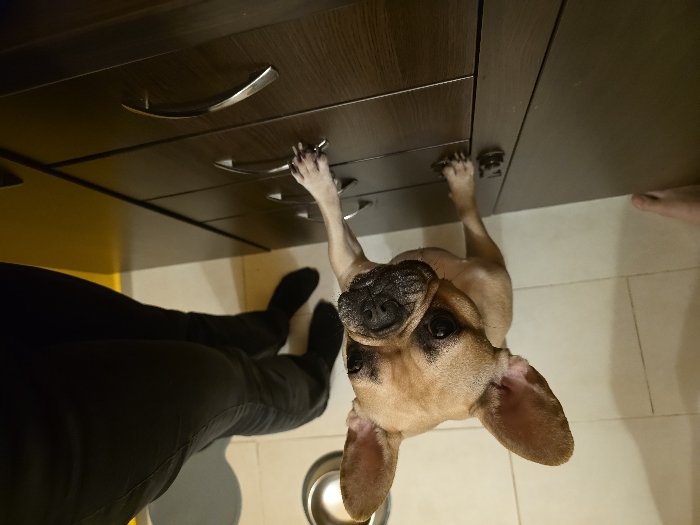 This indoor scene depicts a fawn-colored French Bulldog standing on its hind legs with its front paws resting on the lower portion of a dark brown wooden cabinet. The dog's head is tilted sharply upwards, looking directly at the camera, its snout showing flecks of a light-colored substance. The cabinet has multiple sections with silver, curved handles. To the left, a person's lower legs and feet are visible, wearing dark trousers and dark socks, standing on a light-colored tiled floor. A metallic dog bowl rests on the tiles near this person's feet. A segment of a yellow wall is visible in the background. A bare human foot is partially visible in the bottom right corner, likely belonging to the photographer. The lighting is artificial. The specific location within the city of Plovdiv, Bulgaria, cannot be determined from the visual evidence.