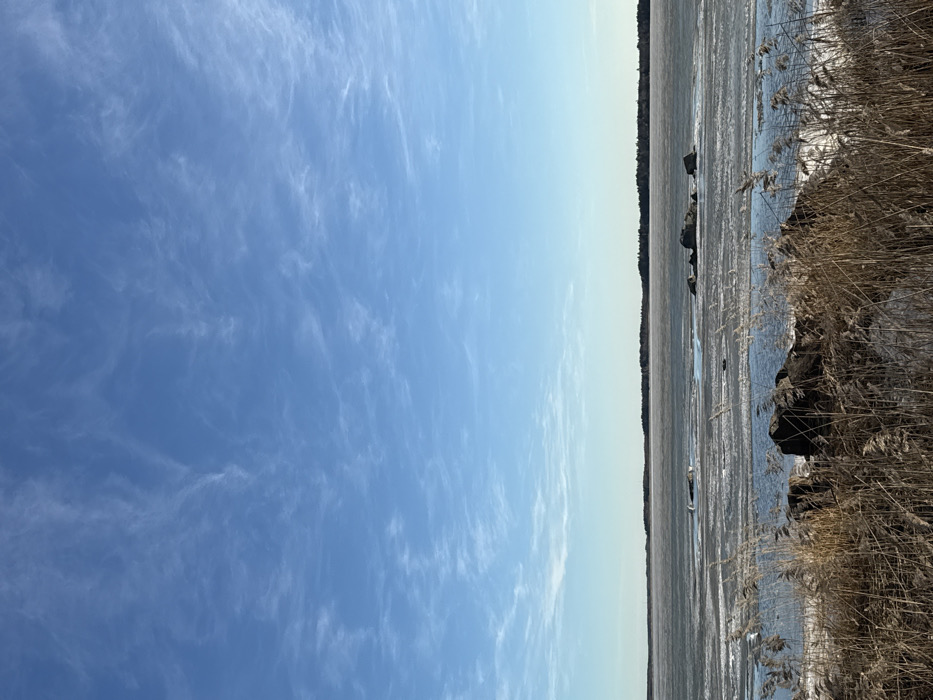The image displays a winter coastal landscape located in Vaasa, Finland. The upper two-thirds of the frame are occupied by a clear, gradient blue sky, transitioning from a deeper blue at the zenith to a lighter hue near the horizon. Sparse, wispy white cirrus clouds are visible across the sky. A low, dark green forested landmass extends horizontally across the distant horizon. The midground and lower-midground feature a body of water partially covered by fragmented, light gray ice and interspersed patches of open, dark blue water. Several dark, irregular rock formations protrude from the ice and water. The immediate foreground consists of dense, dry, light brown reeds and grasses, partially obscuring the base of dark rocks. No human subjects, animals, or man-made structures are present within the frame.