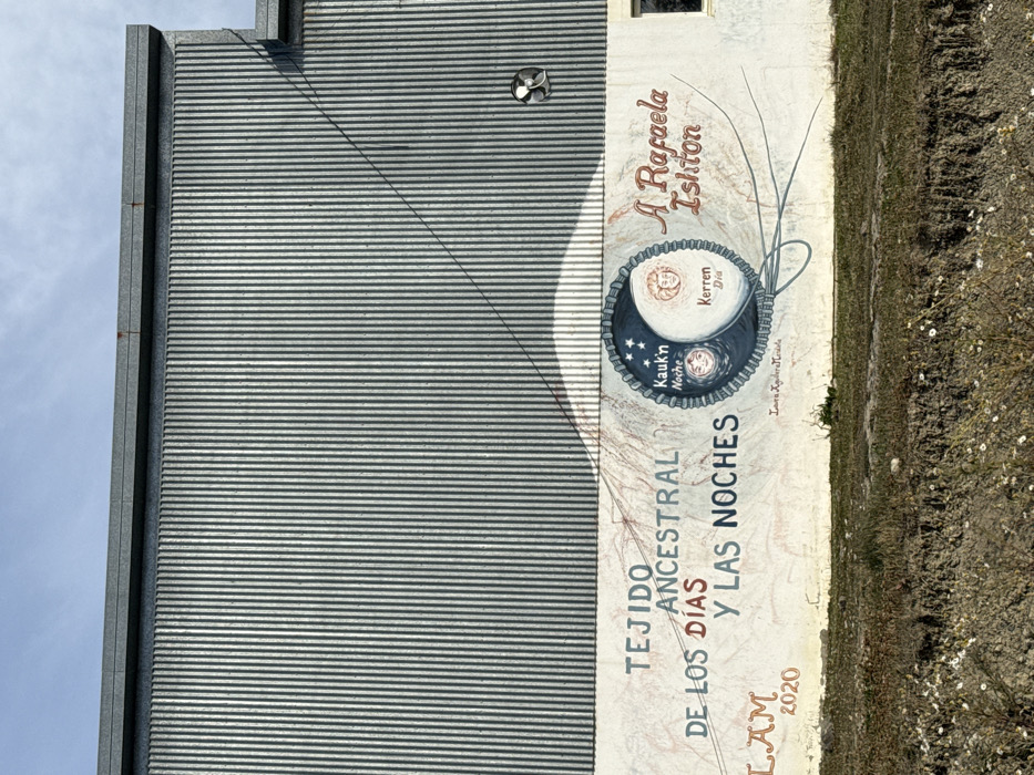 The image displays a section of a building located in Tolhuin, Argentina, beneath an overcast sky. The upper part of the structure consists of vertical corrugated metal siding. A dark utility cable extends diagonally from the upper left, crossing the corrugated metal, and descends into the lower painted section of the wall. A small, dark, circular fixture is mounted on the corrugated metal in the upper right portion. The lower section of the building presents a white-painted wall with a mural. Prominent text on the left reads "TEJIDO ANCESTRAL DE LOS DÍAS Y LAS NOCHES". Below this, "LAM 2020" is visible. On the right, more decorative text states "A Rafaela Ishton". Below the central mural element, the artist's signature "Laura Aguilera Miranda" is present. The central motif is a large circular design with a gear-like border, horizontally bisected. The left half is dark blue with stars and a stylized face, labeled "Kauk'n Noche". The right half is lighter, displaying a different stylized face, labeled "Kerren Dia". The foreground features an unmanicured area of dry earth with sparse, light-colored vegetation and scattered small white flowers.