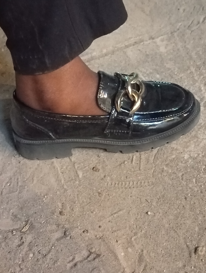 - "A close-up shot shows a person's foot wearing a glossy black loafer with a chunky gold chain detail on the vamp" by FM-hF7Ke2, licensed under CC BY 4.0