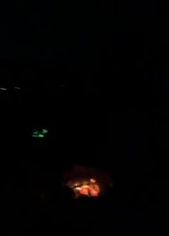 The video takes place at night, in an outdoor setting. Initially, a campfire is visible in the foreground, and flashing colored lights appear in the distance. The background then shows a large area illuminated with red light, possibly from another fire. Finally, the scene shifts to a group of people standing in front of a cliff face lit with green light. There is also a spotlight illuminating the scene.