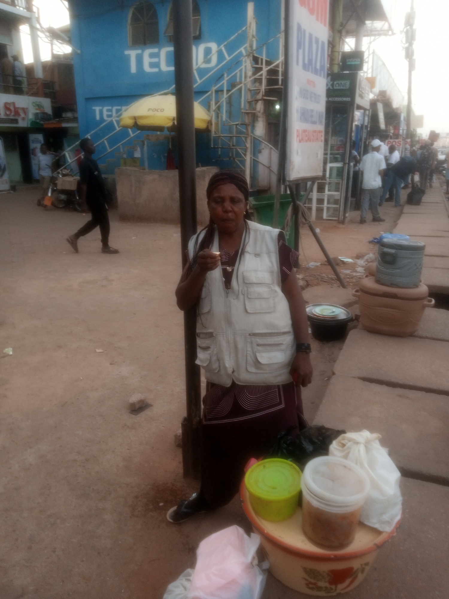 The image depicts an outdoor urban scene in Jos, Plateau State, Nigeria, likely a commercial street or market area. In the foreground, a middle-aged woman with a dark headwrap, a light-colored utility vest with multiple pockets, and a dark patterned garment beneath, stands on a reddish-brown dirt path, facing slightly right of the camera. She holds a small, clear glass or cup to her mouth, appearing to drink. To her immediate right, a light-colored enamel basin on the ground holds a bright green lidded container, a clear lidded container with reddish contents, and white plastic bags. Behind this, a black pot with a light lid is on the ground, and a stack of two lidded plastic containers (one grey, one brown) rests on a concrete slab. The ground consists of uneven dirt and concrete slabs forming a path. In the mid-ground, to the left, a two-story blue building is visible with "TECNO" prominently displayed in white text, and a smaller "POCO" beneath, suggesting a mobile phone or electronics store. A yellow umbrella is partially visible in front of this building. A man in dark clothing walks past this building from left to right. To the right of the central figure, a large white sign is visible with red and blue lettering, including "GSM PLAZA," "IN GOD WE TRUST," and "PLATEAU STATE." Further along the street to the right, other commercial signs like "X ONE" and "POS" are present, and several individuals are visible, indicating a busy thoroughfare with shops and potential street vendors. The background is somewhat hazy, suggesting a dusty atmosphere or distance.