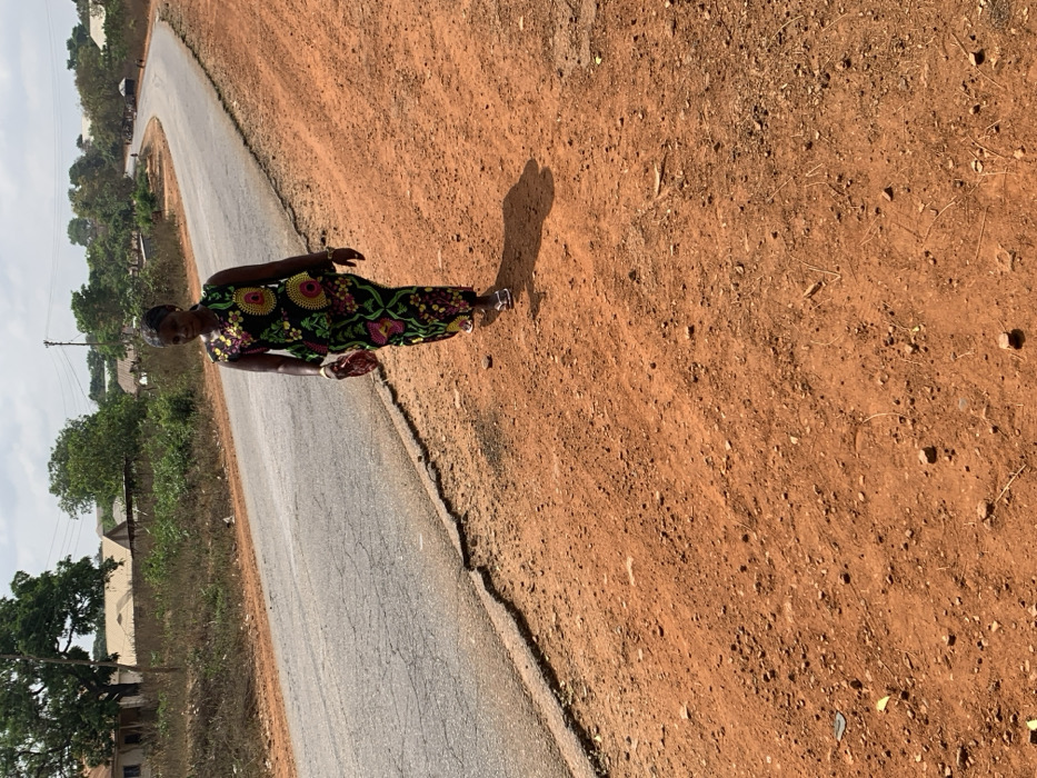 A lone adult female is depicted walking on a reddish-orange dirt shoulder beside a cracked asphalt road in Gbeleko, Nigeria, under a partly cloudy sky during daylight hours
