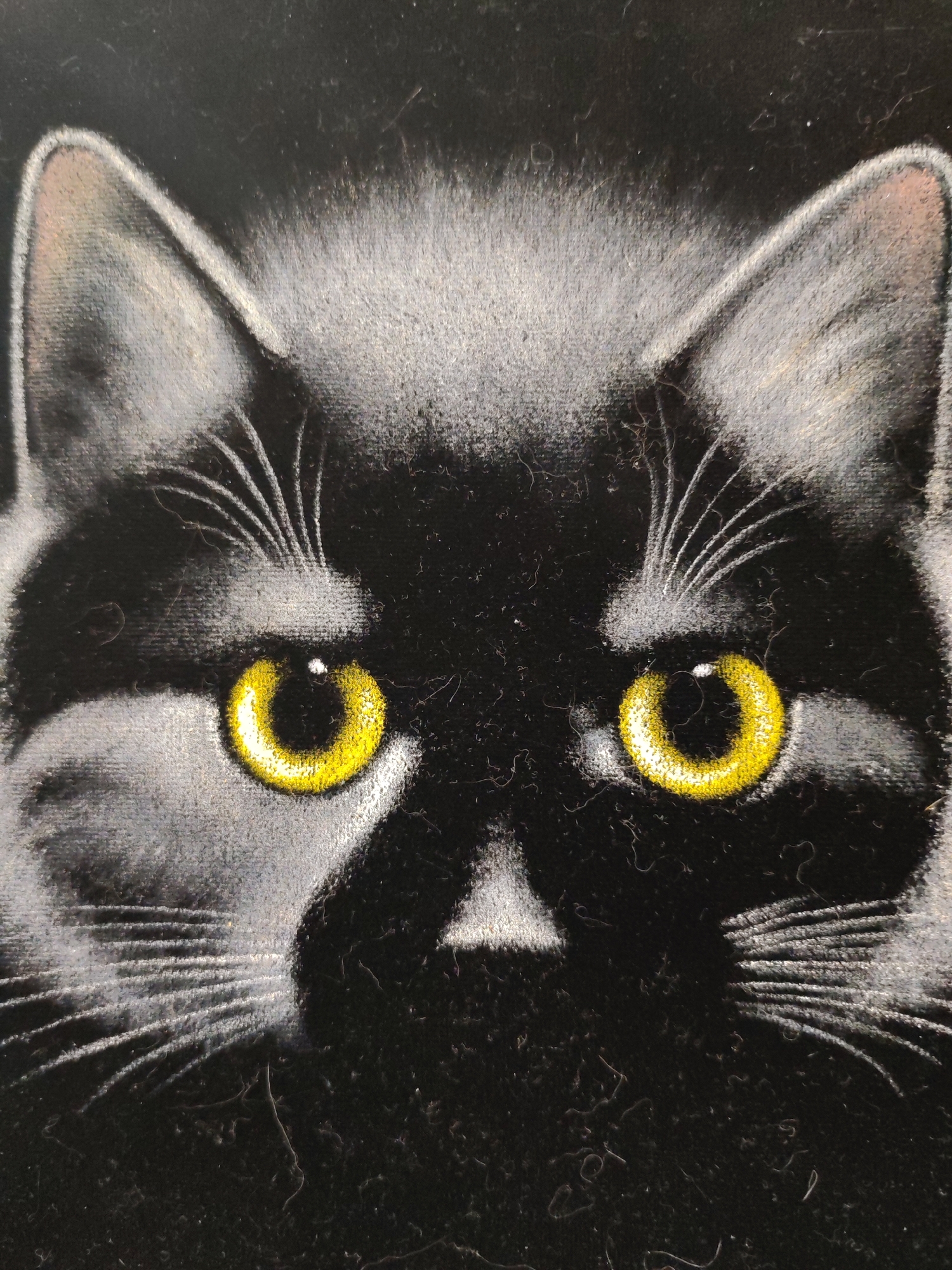 A close-up image shows the face of a black cat with striking yellow eyes