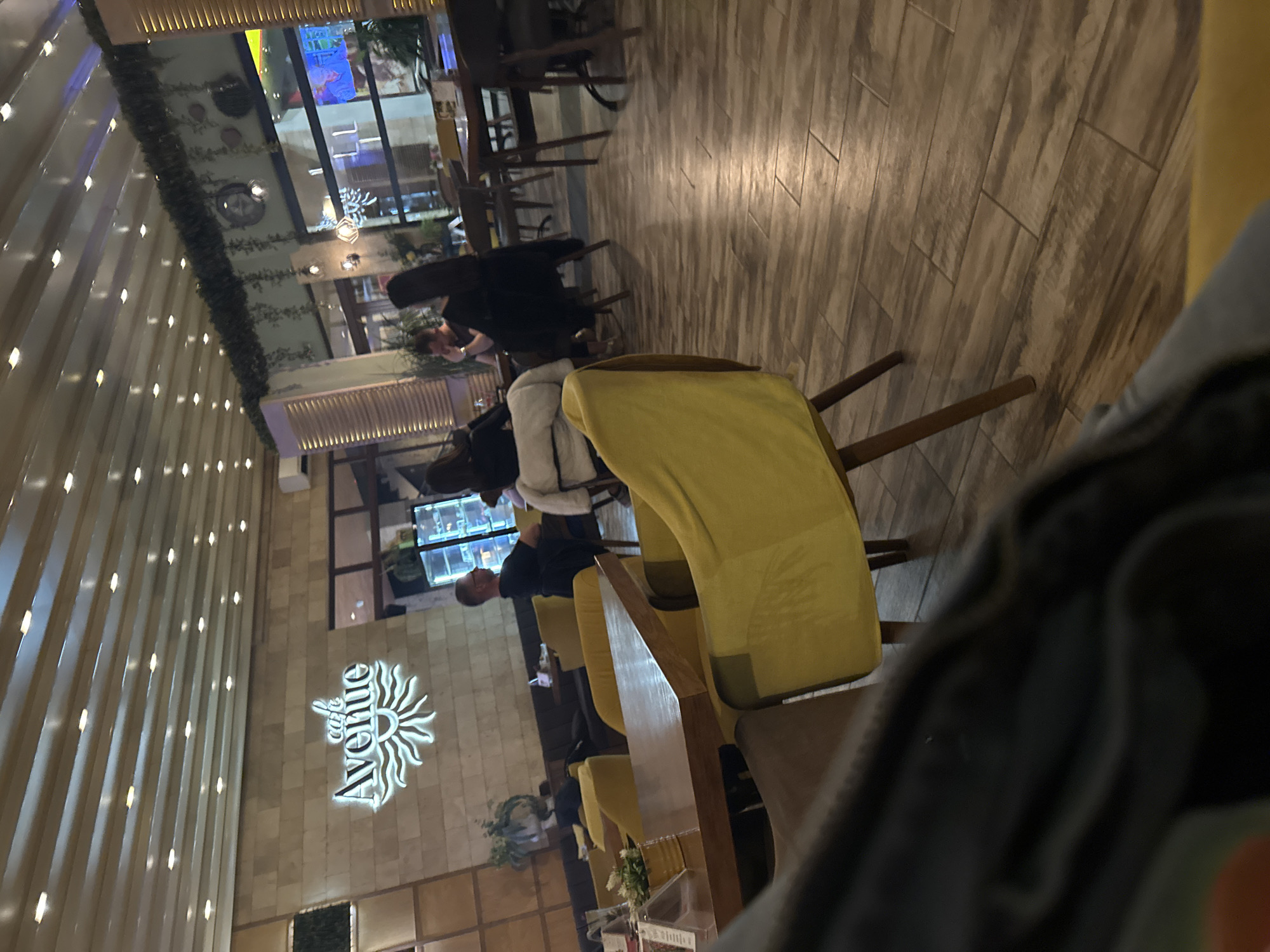 The image depicts the interior of "Cafe Avenue," located in Haskovo, Bulgaria. The establishment features a light-colored, paneled ceiling with numerous evenly spaced recessed lights. The left and rear walls are constructed from light-toned rectangular stone or tile, with a prominent, glowing "Cafe Avenue" sign incorporating a sunburst emblem on the left wall. An air conditioning unit is visible on the upper left wall. Large windows on the right side of the room are adorned with hanging artificial greenery and modern light fixtures, revealing an indistinct exterior. The floor is covered in light brown and grey wood-look plank tiles. Multiple individuals are present, occupying various seating arrangements. In the midground, a man with short hair and glasses, wearing a dark t-shirt, is seated at a dark wooden table with his back partially to the camera, facing left. To his right, another person wearing a white jacket or sweater is seated. Other patrons are visible further back, seated at dark wooden tables with dark upholstered chairs and bench seating. A blue-lit display refrigerator is present in the background. In the immediate foreground, the photographer's dark-clad leg and a yellow upholstered chair are partially visible. A dark wooden table in the foreground holds a small white floral arrangement in a rectangular pot and a menu stand. Yellow upholstered chairs with wooden legs are distributed throughout the cafe. Individuals appear to be socializing or relaxing in the cafe environment.
