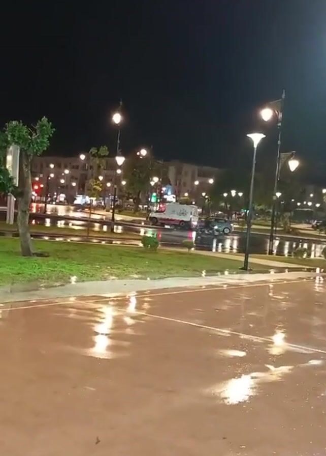 basketball court on a rainy night. The court is wet, and the lights reflect in the puddles. There are streetlights lining the road, and traffic lights are visible in the distance. Cars and a white van with writing in Arabic drive on the wet street. There are trees and grassy areas surrounding the court. The sky is dark.