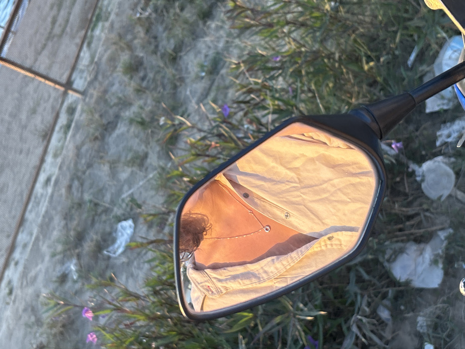 The image displays a black motorcycle rearview mirror positioned in the lower center, reflecting the upper torso and head of an individual. The reflection shows a person wearing a light-colored, possibly tan or beige, collared shirt unbuttoned at the top, revealing a thin gold-colored chain necklace with a small circular pendant. Dark, curly hair is visible near the neck in the reflection. The reflected area is strongly illuminated by warm, directional light, indicating late afternoon sun. Outside the mirror, the immediate environment consists of dry, light-brown soil with sparse green and senescent vegetation, including several plants with small purple flowers. Scattered white and clear plastic debris, such as bags and bottles, is visible on the ground. In the upper right background, a light-colored, possibly wire-mesh, fence runs horizontally across the frame. The overall scene suggests a roadside or undeveloped area within the city of Vang Vieng, Laos.