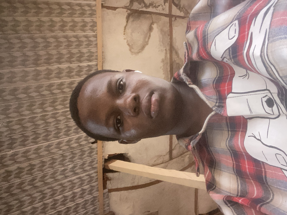 A young, dark-skinned person poses for a selfie. He's wearing a plaid shirt with a cartoonish hand graphic on the side. He has short, dark hair and is wearing what looks like a wireless earbud in one ear. The background appears to be an unfinished or older building, featuring patterned tiles and a wooden beam sticking out of a wall. The image is slightly tilted.