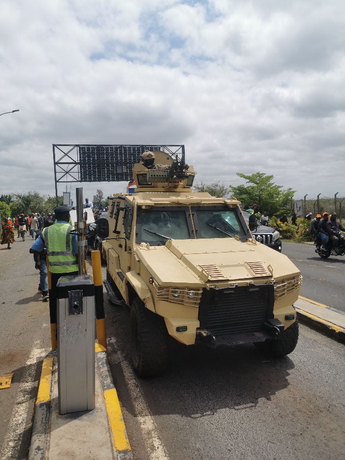 A tan-colored armored personnel carrier (APC) or mine-resistant ambush-protected (MRAP) vehicle is positioned on a paved road at a toll station along the Nairobi Expressway in Nairobi, Kenya, under a partially cloudy sky