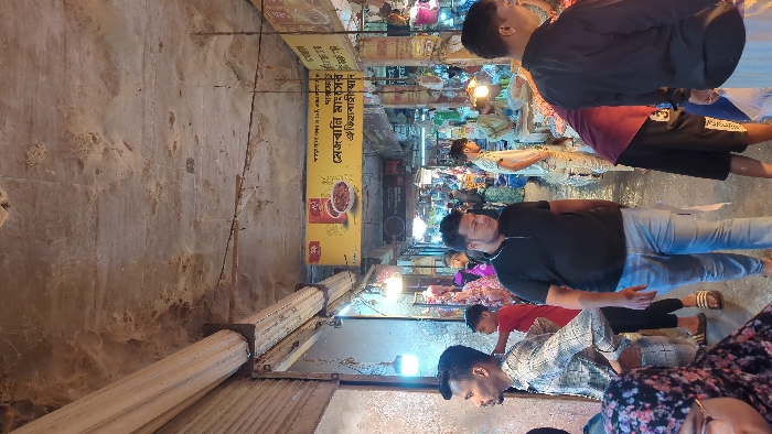People stroll along a crowded market street. Shops line both sides, with signs in a foreign language and goods displayed. The street is bustling with activity, vendors and shoppers alike. The ground appears weathered and worn. Artificial lights illuminate the scene. Some of the individuals are looking towards the market, while others are interacting with each other.