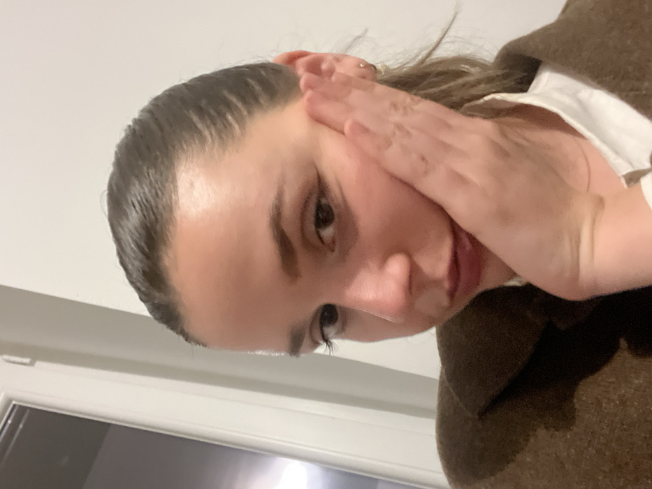 A young woman tilts her head downward and to the side, partially obscuring her face with her hand. Her dark hair is slicked back, revealing a smooth forehead. One eye is visible, with long eyelashes. She wears a white collared shirt and a brown jacket. The background includes a white wall and a window.