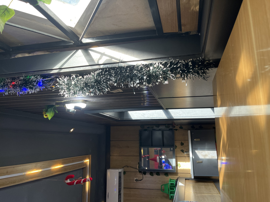 The image depicts the interior of a commercial establishment in Sabon Gari East, Nigeria. The foreground is dominated by a reflective, light-colored wooden tabletop. To the left, a white air conditioning unit is mounted on a wooden-paneled wall. Below it, a dark grey vanity unit with a white sink is present, beneath a wall-mounted mirrored cabinet. The mirror reflects a red and white striped object, consistent with a Santa hat, along with blue lights, suggesting further interior decoration. Artificial green vine foliage is draped around the mirrored cabinet and adjacent wall. A green plastic caddy rests on a light-colored counter surface to the far left. To the right, a vertical column of silver tinsel garland adorned with multi-colored LED lights (red, green, blue) extends upwards. Adjacent to this, a wall-mounted sconce light with a yellowish glow is visible, accompanied by a small artificial sunflower decoration. Strong, direct sunlight enters from a large window or glass partition on the far right, casting distinct shadows and reflections across the surfaces and the dark metal framing of the window structure. A dark seating area or bench is partially visible along the right edge, behind the tinsel. The ceiling is dark grey, featuring recessed spotlights and a rectangular false ceiling section with linear warm-toned lighting. A red and white striped candy cane ornament hangs from the ceiling in the upper left quadrant. No individuals are present in the scene, and no active interactions are observed.