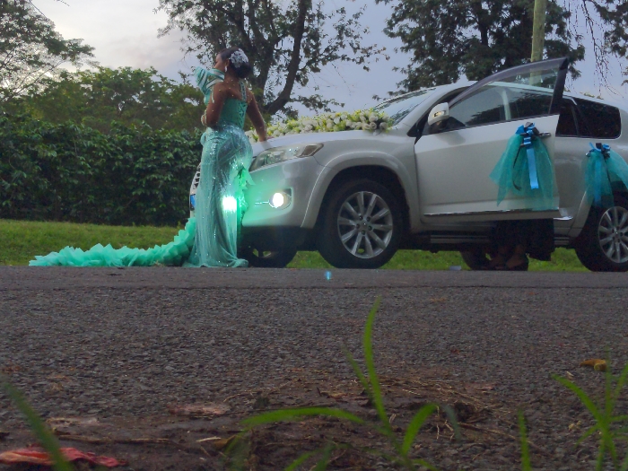 A woman in a turquoise gown stands in front of a white Toyota RAV4, in New Hope, Tanzania, located at coordinates (latitude: -3.275, longitude: 37.317). The gown has a long train that trails behind her. She is positioned to the left of the vehicle, her right hand resting on the hood of the vehicle. The car has a blue ribbon tied to the door handle. The scene is partially obstructed by foliage in the foreground. The location is on a paved road and there are trees and shrubs in the background. The sky is overcast.