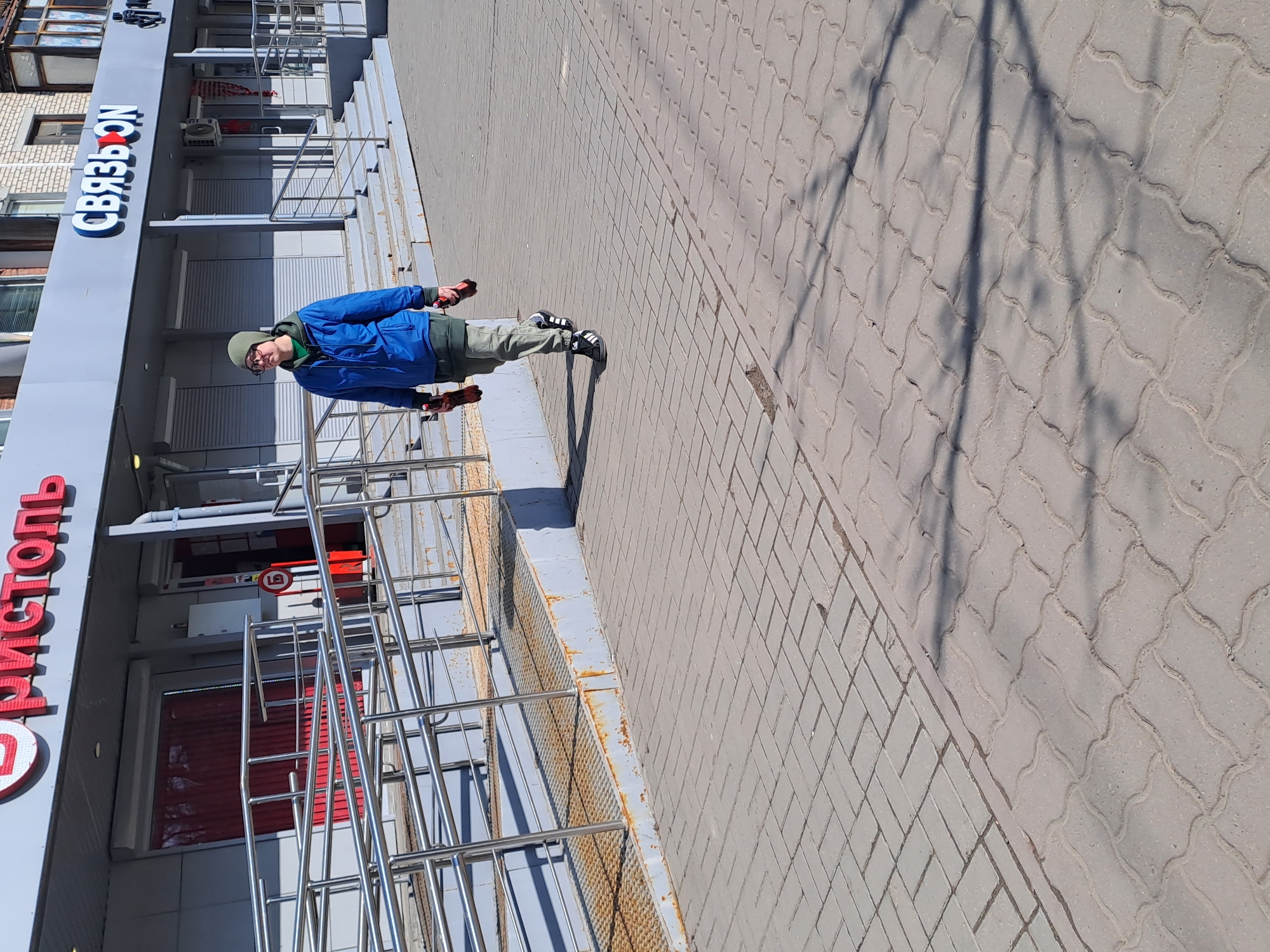 In Меткомелино, Russia, an outdoor scene depicts a single individual walking on a paved sidewalk in front of two commercial storefronts. The individual, appearing male, wears a dark green beanie, glasses, a blue puffer jacket over a green hooded sweatshirt, light grey trousers, and black Adidas sneakers. They carry one red bottle with a black cap in each hand. To the left of the individual is a storefront with the red and white "БРИСТОЛЬ" sign, featuring a closed red roller shutter and an accessible ramp constructed of corrugated metal with stainless steel handrails, showing signs of rust. A red cylindrical object with a white 'Б' symbol is positioned near the entrance. To the right, another storefront bears the blue and white "СВЯЗЬОN" sign, with multiple windows and doors obscured by what appear to be closed roller shutters, accessed by concrete steps also fitted with stainless steel handrails. An air conditioning unit is mounted above this storefront. The sidewalk is paved with grey interlocking concrete blocks, transitioning from rectangular patterns closer to the buildings to a wavier pattern further out. Long, indistinct shadows are cast across the sidewalk from the right, suggesting bright sunlight. The sky is clear and light blue.