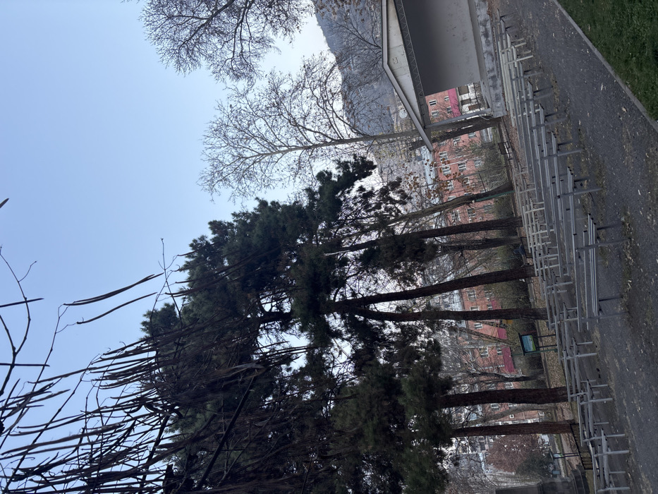 The image depicts an outdoor amphitheater located in a park in Kapan, Armenia. The scene is devoid of people. In the foreground, numerous rows of empty, unpainted metal benches are arranged on a dark, possibly gravel or dirt, ground, facing a concrete outdoor stage structure visible on the mid-right. The stage has a light grey gabled roof and a white, solid back wall with a dark, open front. To the left and center of the frame, several tall, slender evergreen trees with dark foliage stand, intermingled with bare deciduous trees exhibiting thin branches, characteristic of late autumn or winter. The upper left portion of the image shows dark, bare branches with numerous long, dry seed pods hanging, obscuring part of the sky. In the mid-ground, behind the trees and benches, multiple multi-story residential buildings with reddish-brown facades and numerous windows are visible, indicating an urban setting. A small information sign with an illustration is partially visible near the base of the evergreen trees. The background features a large, vegetated hillside or mountain under a clear, light blue sky. A narrow strip of green grass is present on the far right edge of the foreground.