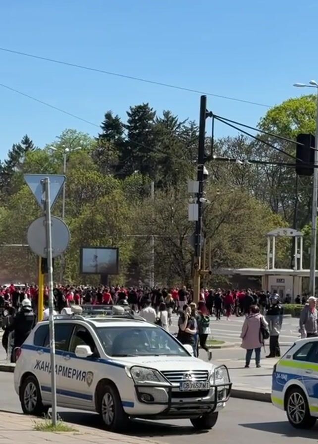 large crowd of people walking on a street, observed by police forces and a "ЖАНДАРМЕРИЯ" (Gendarmerie) vehicle parked nearby. The sky is clear and sunny. The crowd is walking away from the camera, towards a park or green area. Some people in the crowd are wearing red clothing. Several police officers are visible along the edge of the road. One person is taking a photo of the crowd with their phone. The video is shot during the daytime.