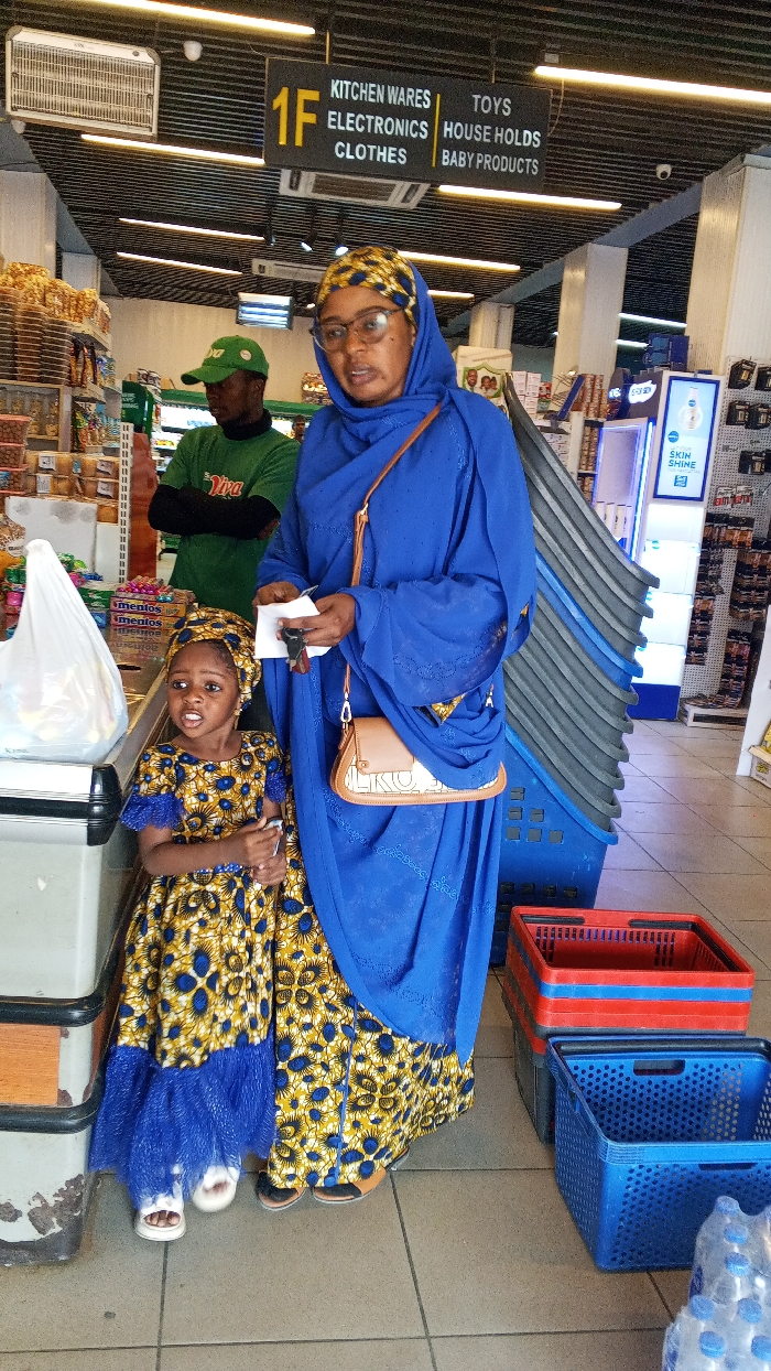 Inside a supermarket in Tarauni, Nigeria, an adult female and a young female child stand near a checkout counter