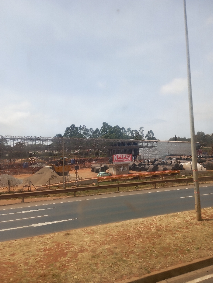 This image depicts an outdoor industrial or construction site located in Kikuyu Township ward, Kenya, viewed from across a multi-lane asphalt road under a partly cloudy sky. In the immediate foreground, a reddish-brown dirt shoulder with sparse, dried vegetation separates the viewer's perspective from the paved road. The road features three visible white arrow markings indicating forward vehicular movement. A metal guardrail runs parallel to the road, forming a boundary with the industrial area. To the right, a tall, slender grey utility pole extends vertically out of the frame. Beyond the road and guardrail, the primary subject is an active site. A prominent red and white sign displays "K PIPES HARDWARE." Adjacent to it, a small, light-colored structure with a dark roof is visible. The site contains numerous dark, cylindrical pipes stacked horizontally, along with several white cylindrical tanks or containers. Large piles of reddish-brown dirt and grey gravel are present. A yellow construction vehicle, possibly a loader or excavator, is parked near these piles, and a white truck is partially visible further left. In the background of the site, a large building framework under construction is partially covered with white sheeting, featuring extensive metal scaffolding or structural elements. Dense green trees form a natural backdrop behind the construction activity. No individuals, explicit actions, or interactions are discernible within the scene.
