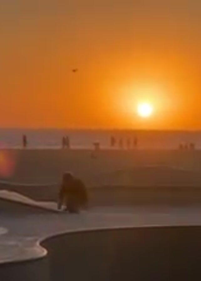 skatepark with a beach and ocean in the background during sunset. The sky is a gradient of orange and yellow. Several people are visible on the beach and around the skatepark. A person is skateboarding on the ramps. Birds fly in the sky. The skatepark is made of concrete with curved structures. Some people are sitting on the edges of the skatepark.