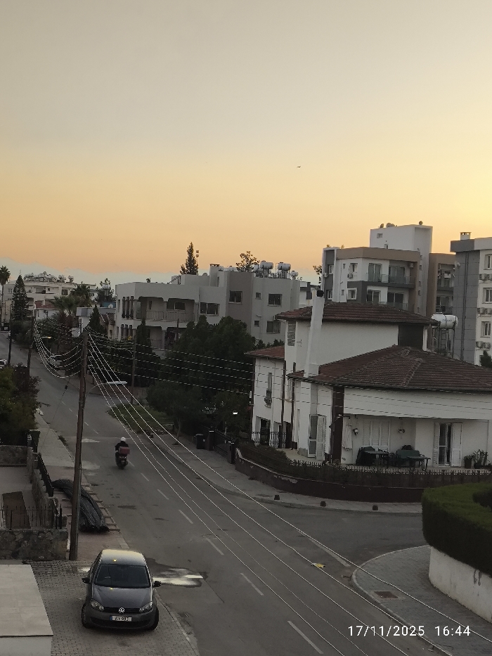 The image depicts an urban street scene in Nicosia, Northern Cyprus / Cyprus, captured at 16:44 on November 17, 2025. The sky exhibits a sunset gradient, transitioning from a warm yellow-orange at the horizon to a paler beige overhead, with a small, dark speck visible in the upper right quadrant. In the foreground, a dark grey Volkswagen Golf (license plate GY 032) is parked on the left side of a paved area that meets a road. The road, appearing to be asphalt, slopes slightly uphill and curves to the right, extending into the mid-ground. A single individual on a dark-colored scooter with a white top box is observed in motion on the road, heading away from the viewer. Overhead, numerous white utility wires are strung across the scene, connected to a wooden utility pole positioned on the left side of the road. To the right of the road, a low stone wall supports a dark green hedge. Beyond the hedge, a two-story residence with white walls and a reddish-brown tiled roof features multiple windows with white shutters and an outdoor patio set. Behind this, another white building with a similar tiled roof and a prominent chimney is visible. The mid-ground and background are dominated by a mix of residential structures. These include several multi-story apartment buildings, predominantly white or light grey, featuring balconies and numerous windows. Many of these buildings have solar water heaters installed on their rooftops. Green foliage from trees and bushes is interspersed among the buildings and along the street. Distant, hazy landforms are visible on the horizon beneath the sunset sky.