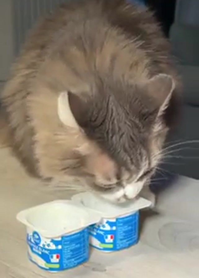fluffy, grey and brown cat on a light brown wooden surface. The cat is lapping at the inside of two small, blue-and-white yogurt containers. The cat's head is lowered as it consumes the yogurt. The background is out of focus, but reveals a white radiator and a dark doorway leading to another room.