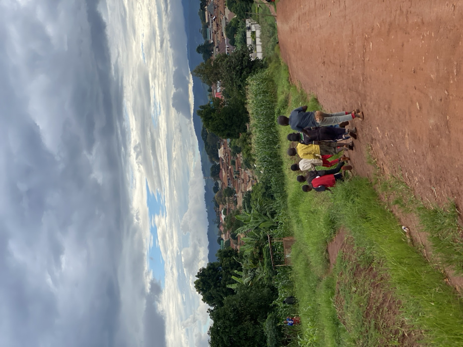 dirt road in Mbinga, Tanzania (latitude: -10.947, longitude: 34.997). A group of seven children are walking down the road. They are all dressed in casual clothing, and they are walking in a single file line. The children are all looking ahead, and they are not interacting with each other. The road is dusty and the surrounding vegetation is lush green. There are several buildings in the distance, along with a mountain range. The sky is cloudy and overcast. A person in red clothing and another in green clothing can be seen in the left foreground. A small wooden structure is in the middle-left, partially obscured by vegetation. The terrain is slightly sloped, with the road appearing at the base of the slope.