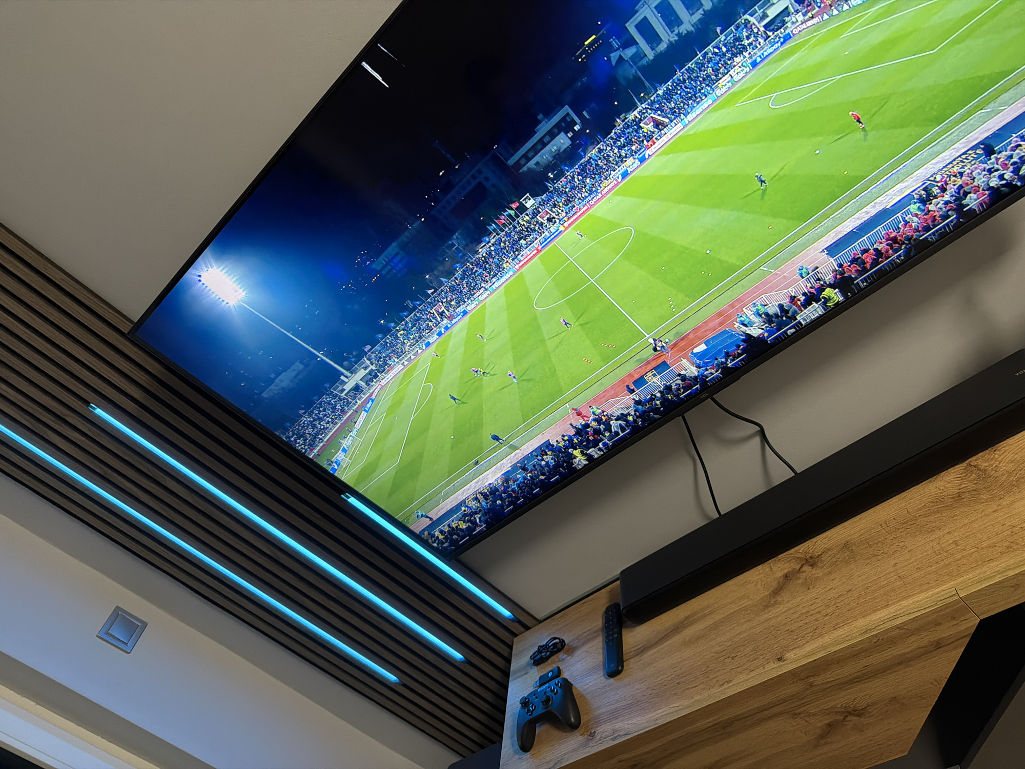 television displaying a soccer game being played in a stadium. The stadium is filled with spectators. The television is mounted on a wall above a soundbar, a remote control, and a game controller on a wooden shelf. The wall has wood paneling with integrated blue LED lighting. The setting appears to be inside a home. While the specific stadium and location in Sofia, Bulgaria cannot be identified from the image, it is possible the game shown is being played in the city if the person who took the photo is in Sofia.
