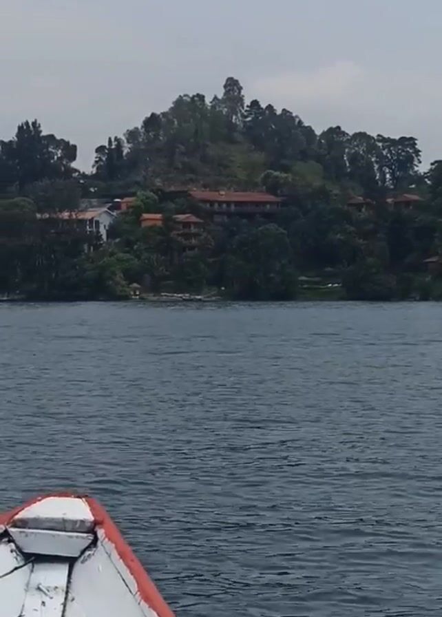 body of water, presumably a lake, from the perspective of a moving boat. The water is dark blue with gentle ripples on the surface. The foreground of the shot includes a portion of the boat's bow, painted white with a red trim. In the background, across the water, is a lush green hillside covered in trees and vegetation. Several buildings with red-tiled roofs are visible among the trees on the hillside. The sky is overcast and gray.