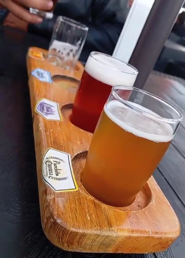 The scene shows a wooden tray holding four glasses, each placed in a circular cutout. The glasses contain different types of beer, with one glass empty. Two of the glasses hold beers that are light brown and red in color, respectively. Some of the cutouts in the tray have stickers with beer brand logos. A person in a black jacket is holding a glass, and another person is partially visible in the background. The tray rests on a dark-colored table, with a white object standing behind it. The environment appears to be an outdoor seating area of a restaurant or bar.