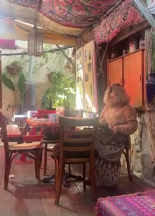 A woman is seated in a uniquely decorated outdoor space. She wears a tan sweater and a long patterned skirt, and appears to be reading. She sits at a wooden chair near a table set with items. The area is enclosed by a colorful patterned awning. The flooring is wooden, and plants are visible in the background. The scene looks like a cafe or a restaurant patio. The sun shines into the space.