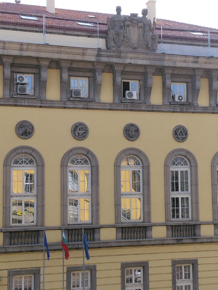 This image depicts a section of the Burgas Municipality building (City Hall) located at pl