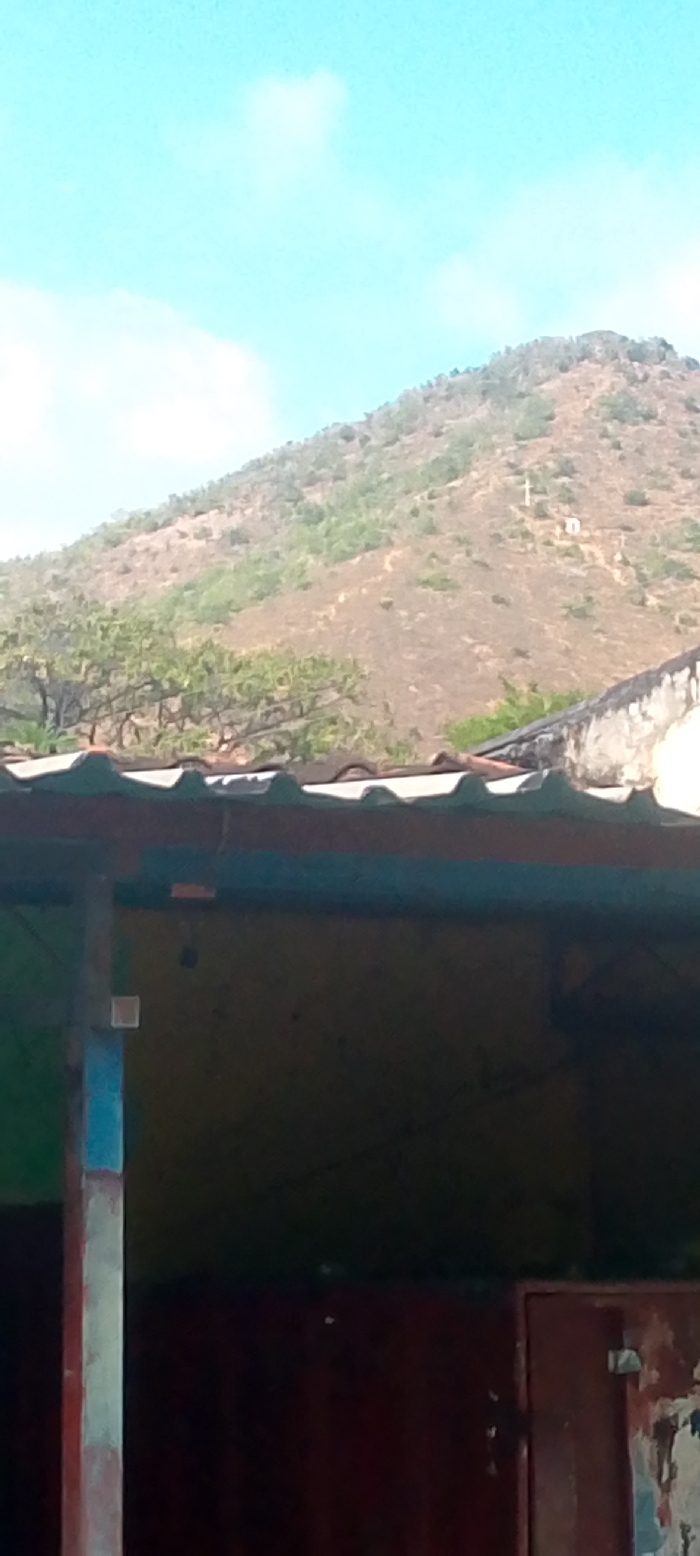 The image displays a daytime scene in Santa Ana, Venezuela, under a light blue sky with sparse white clouds. A large, arid mountain or hill dominates the background, characterized by brown earth and scattered green vegetation, including low-lying bushes and trees. A prominent white cross is visible on the mid-slope of the mountain, accompanied by a small, light-colored structure, consistent with a shrine or small building. Multiple faint paths or erosion patterns are present on the hillside. In the midground, a line of green-foliage trees partially obscures the lower mountain. The foreground is occupied by architectural elements. A roof with reddish-brown and dark green corrugated tiles stretches horizontally across the middle of the frame. Beneath this roof, a dark, shadowed interior space is visible. On the left, a vertical support column or beam, painted with blue, white, and reddish-brown vertical stripes, extends upwards. A small, light-colored square object is affixed to this column. Within the shadowed area, a dark, spherical object hangs from what appears to be a ceiling. To the right, a reddish-brown wall or door, exhibiting signs of peeling paint and wear, is partially visible. No individuals are present in the scene.