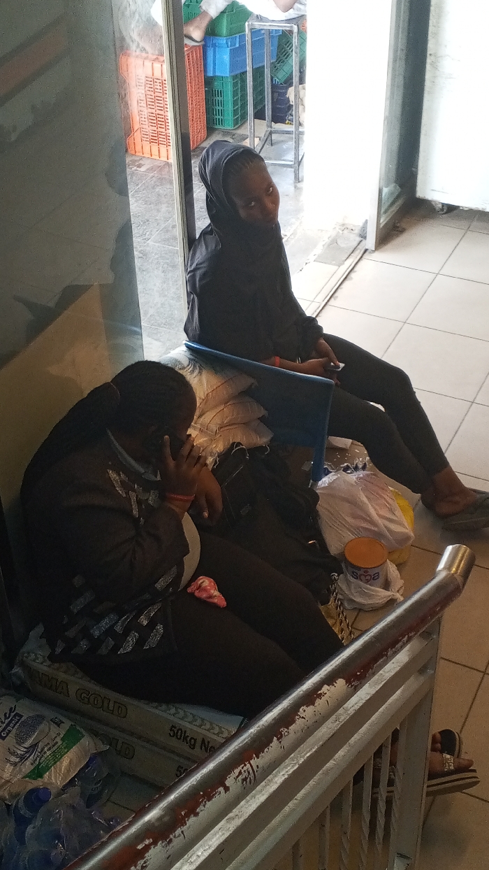 The scene depicts an interior space, likely a waiting area or entryway, in Tarauni, Nigeria. Two individuals are seated in the foreground. On the left, a person with dark braided hair, wearing dark clothing, is seated on multiple stacked white sacks labeled "Mama Gold 50kg Net." This individual holds a mobile phone to their left ear, a red bracelet visible on their left wrist, suggesting a phone conversation. A small pink object rests on their lap. To their right, a second individual, wearing a black hijab and black clothing, is seated on a light blue plastic stool, looking directly towards the viewer. This individual's hands rest in their lap, possibly holding a small dark object. Between the two individuals are a black bag and several white plastic bags, some containing bottled water, along with an orange cylindrical container. Through an open doorway in the background, a brightly lit exterior is visible. Stacked orange, blue, and green plastic crates are seen, along with the lower legs and bare feet of a person in white clothing. The floor is tiled with light-colored squares. A metal railing, silver with extensive red paint chipping, crosses the lower right foreground diagonally. Shadows are cast on the left wall and floor, indicating light entering from the right.
