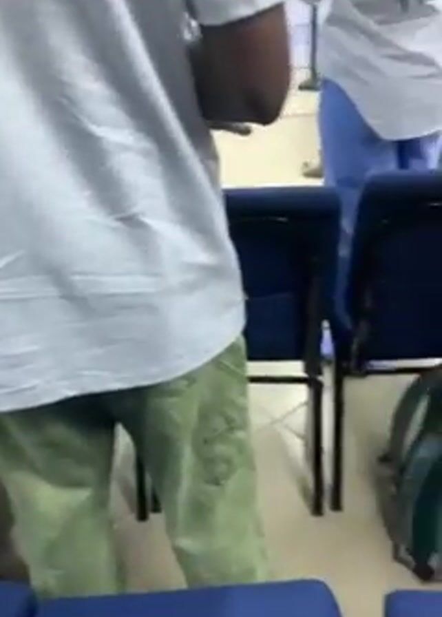 n indoor scene where several people are gathered in what appears to be a church or meeting hall. People are standing, with the backs of their torsos visible to the camera. A few people are wearing light colored tops and the pants are of varying colors. A stack of papers are on a blue chair. Blue chairs and a backpack are also in the frame. There seems to be a screen in the background with text and designs on it. The lighting appears to be artificial and the focus of the camera is mostly on the people.