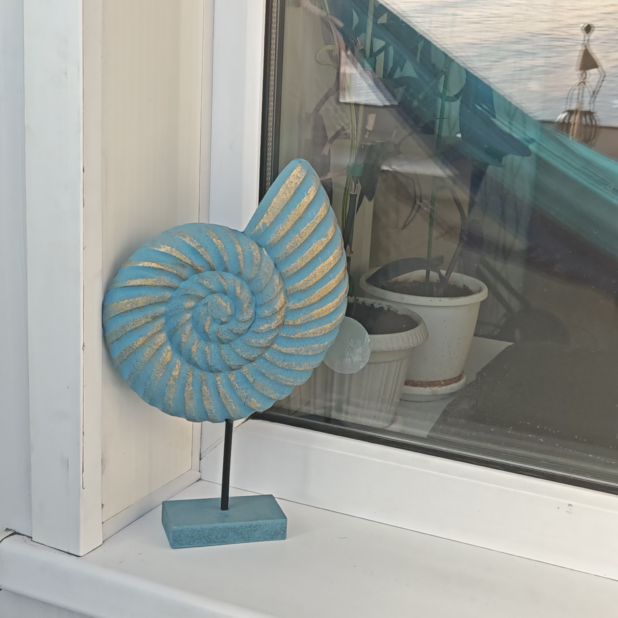 This image presents an interior windowsill scene, located in the city of Rostov Veliky, Russia. Positioned on a white windowsill, a decorative object shaped like a nautilus shell is prominently displayed. The shell is light blue with raised gold horizontal stripe detailing, mounted on a slender black support rod attached to a small, rectangular light blue base. To the right of the shell, a window pane reveals both indoor objects and outdoor reflections. Inside, at least two white potted plants with dark soil are visible. The window reflects a calm body of water in the upper right, a diagonal section of a dark green fabric or netting, and an ornate metal lantern. The white window frame and sill exhibit minimal surface marks. No individuals are present.