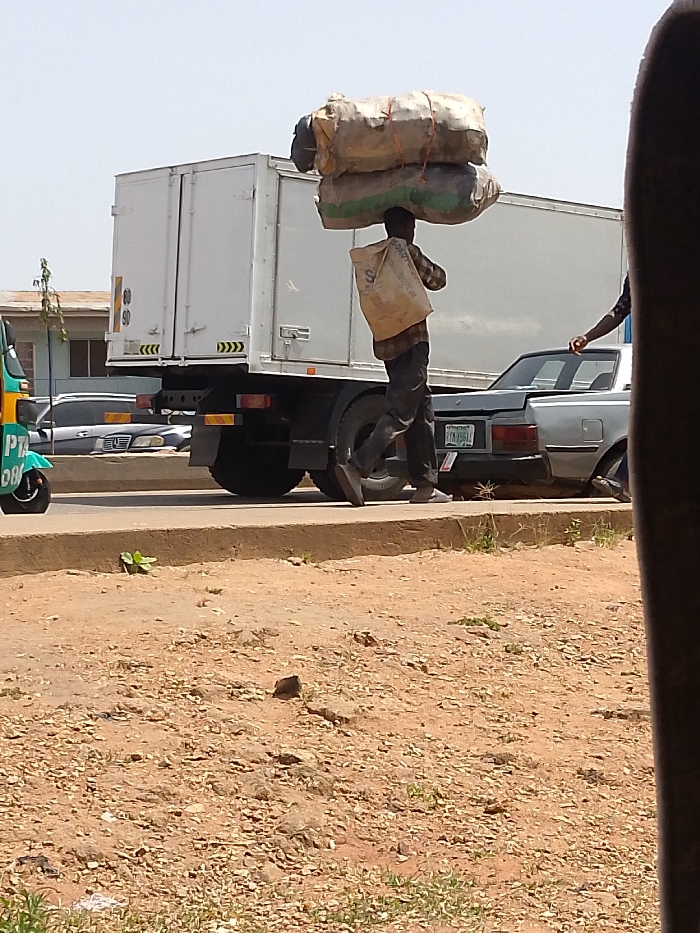The image displays an outdoor, daytime street scene in an urban or semi-urban environment in Jos, Nigeria