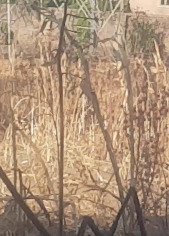 n obstructed view of a yard or area filled with dried straw or similar material. There are tree branches or sticks scattered across the surface. In the background, there is a building, partially obscured, with a single window visible. To the left, a metallic structure, possibly scaffolding, can be seen. The overall scene appears to be slightly out of focus or of low resolution.