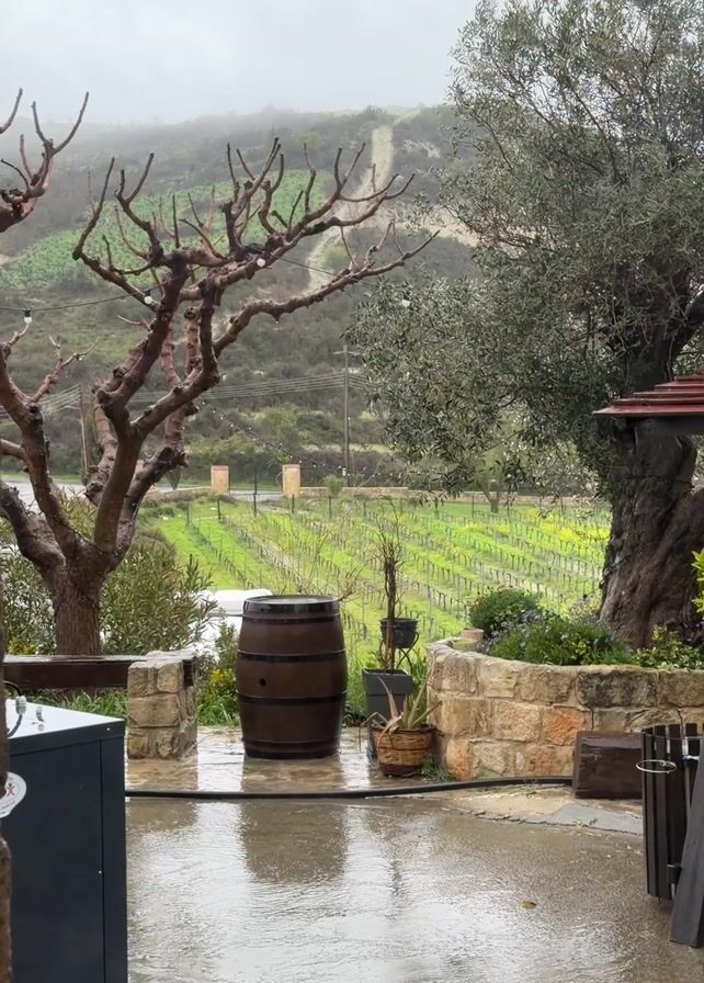 vineyard on a rainy, overcast day. In the foreground, a stone patio is covered in puddles. A wooden barrel sits in the center of the patio, flanked by stone walls and plants. To the left is a bare tree with outstretched branches, and to the right is a large olive tree. Beyond the patio, a green vineyard stretches across the landscape, with rows of grapevines. A road or path winds up a hillside in the distance, partially obscured by fog. In the extreme lower left of the frame, there is a glimpse of a gray cabinet or container. A voice can be heard in the background. As the video progresses, what appears to be small flakes of snow or ice are falling.