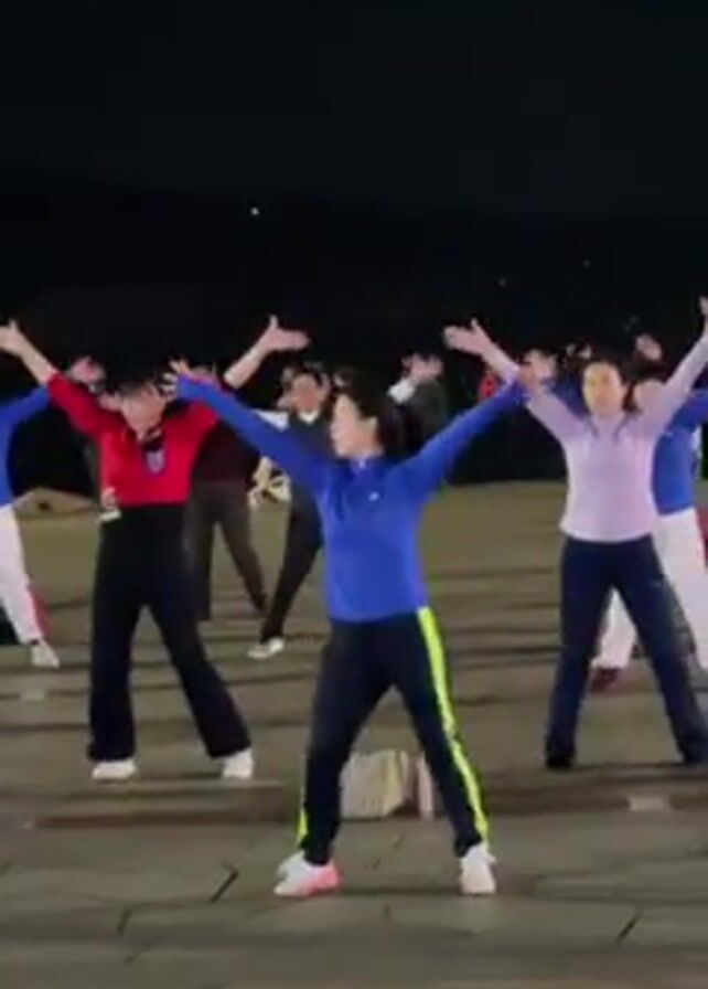 A group of adults are dancing or exercising together outside at night. The setting appears to be a public square or paved area. Most of the participants are dressed in athletic wear, including blue or red tops and dark pants, and some are wearing sneakers. They move in unison, performing arm raises and reaching motions, following the lead of someone off-camera. There are other people standing around watching, and the scene is illuminated by artificial lighting. The atmosphere suggests a community activity or organized exercise class.