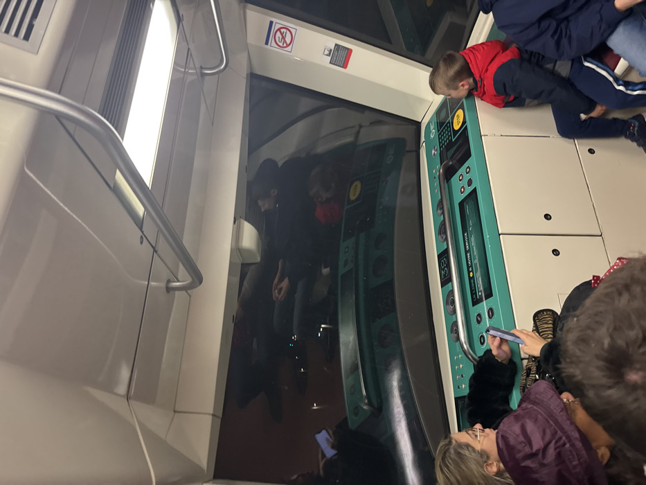 Inside a metro train car, a doorway leads to an adjacent, crowded car. People are visible in the doorway, with some holding onto handrails. A young boy in a red and black jacket is peeking into the other car, leaning on the panel next to the door. An adult is taking a picture with their phone, and a few other people are visible in the foreground. The train car's interior is white with a bright, rectangular light fixture.